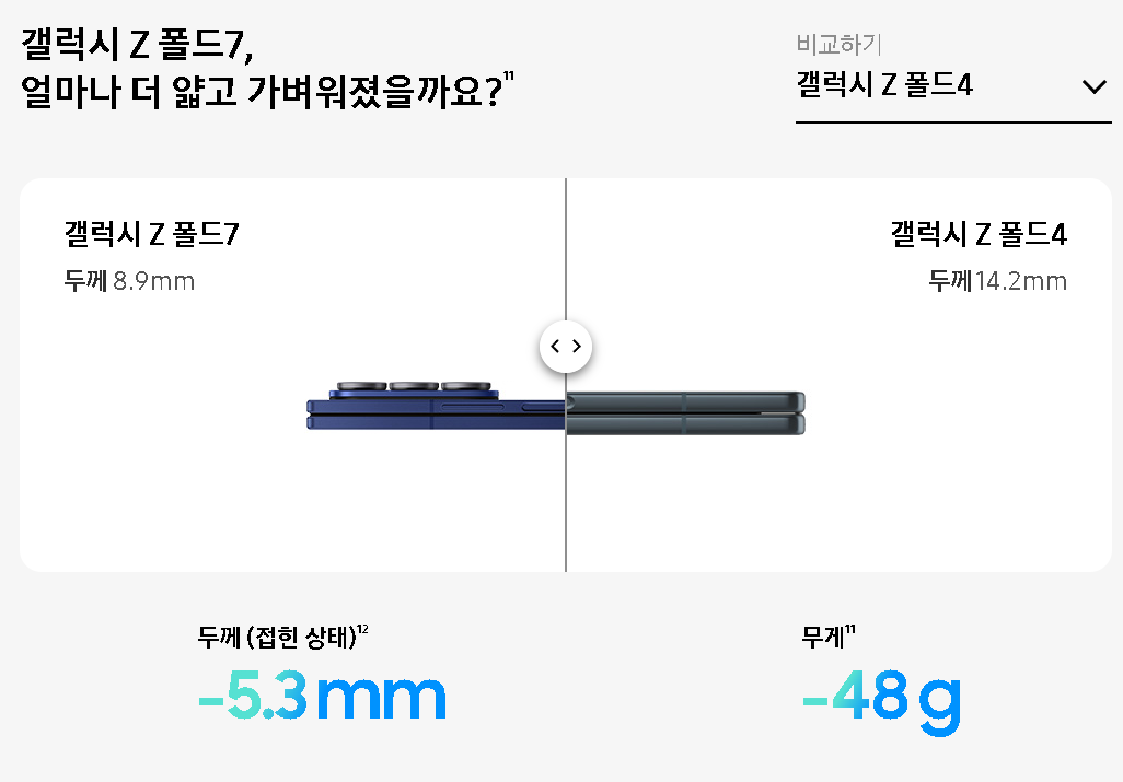| 두께 | 4.2mm(펼침) / 8.9mm(접힘) | 6.1mm(펼침) / 13.4mm(접힘) |