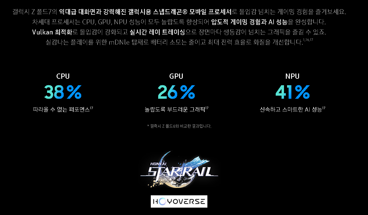 - 칩셋 : Snapdragon 8 Elite for Galaxy - NPU 41%, CPU 38%, GPU 26% 성능 향상