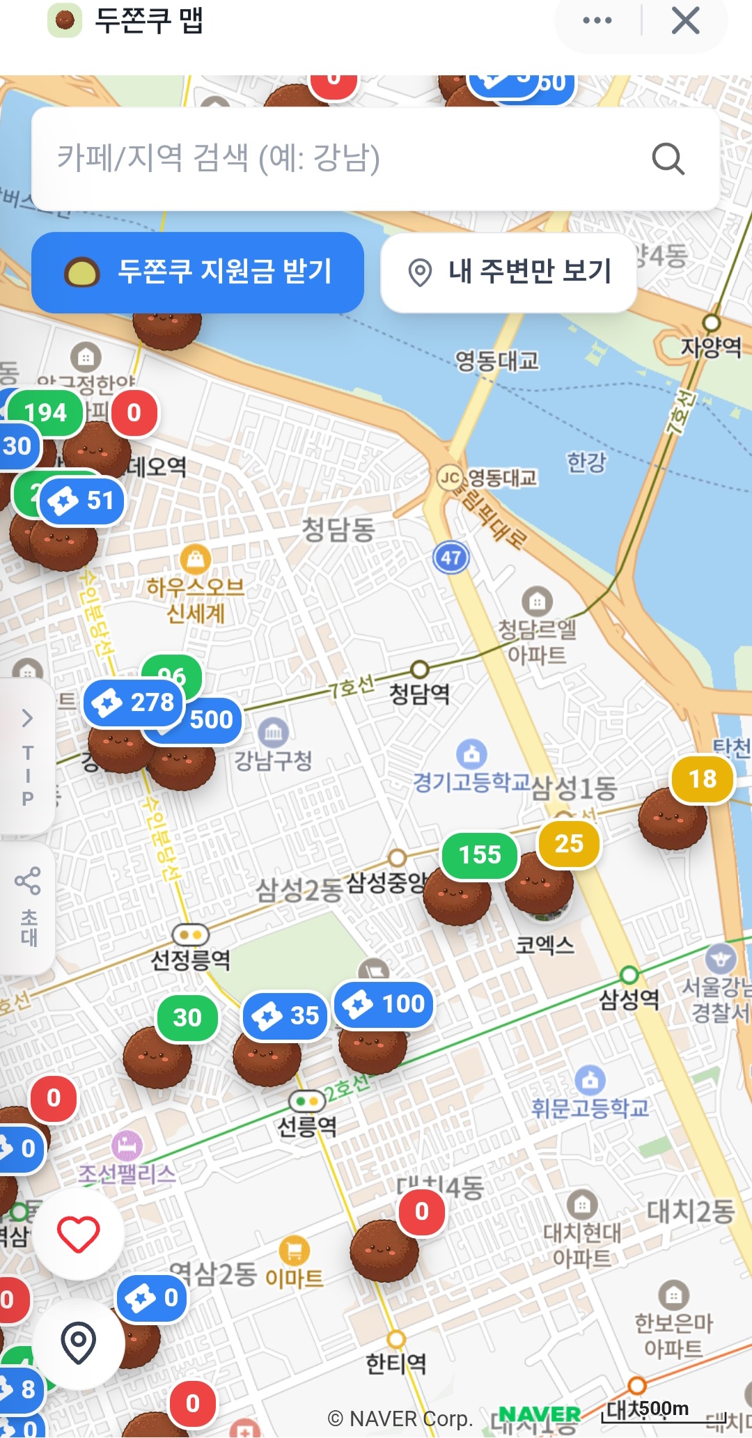 토스 두쫀쿠 맵은 두쫀쿠를 판매하는 매장을 지도 위에서 바로 확인할 수 있는 서비스입니다. 매장 위치는 물론이고 두쫀쿠 재고 수량까지 숫자로 표시되어 있어요.